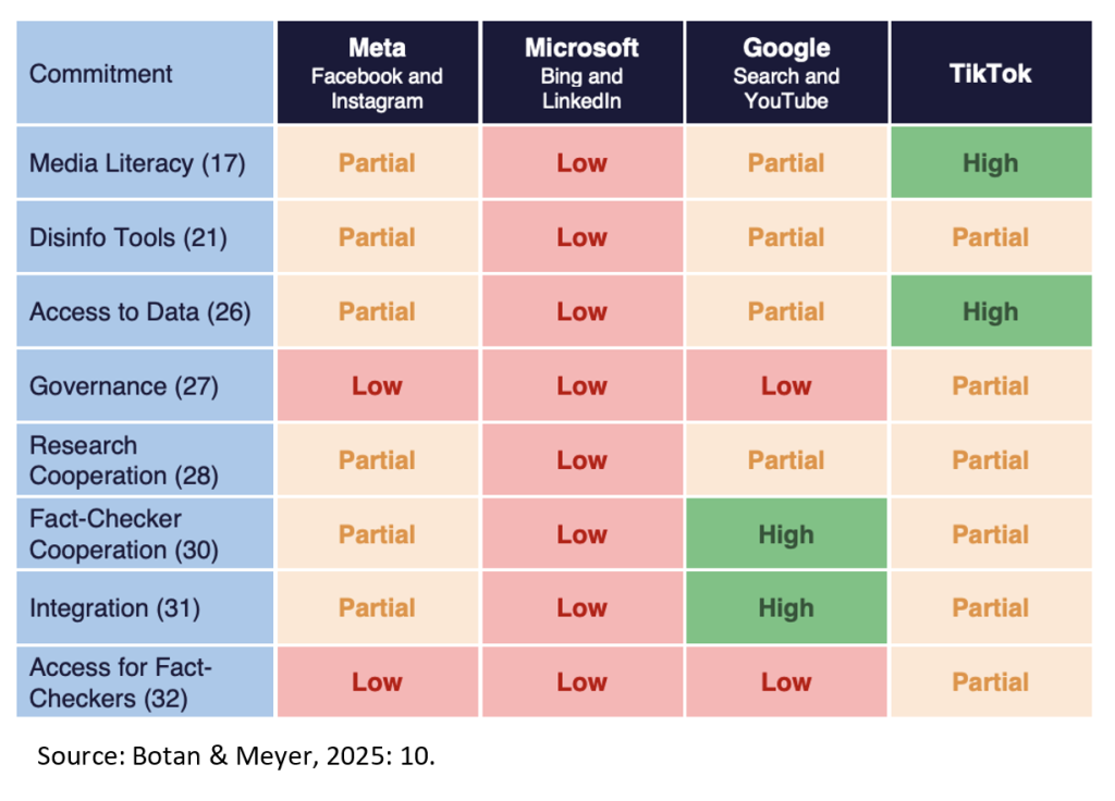 Overall, EDMO’s report reveals persistent shortcomings in transparency, independent oversight, and impact evaluation across all commitments that were included in the analysis. As a result, the current implementation of the Code appears fragmented and performative (see the overview in Table 1). Comparative compliance across all commitments raises concerns about its capacity to deliver substantive improvements in limiting the spread of disinformation.