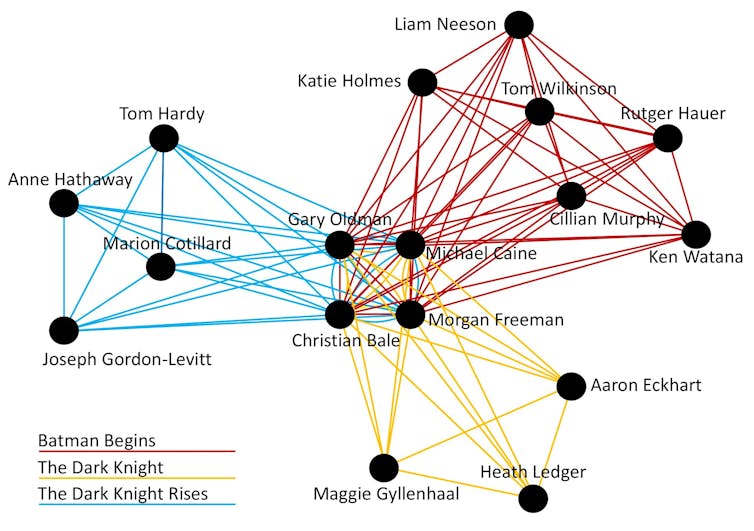To give an example, the picture below shows the social network of actors appearing in Christopher Nolan’s three Batman movies. Each node in this network corresponds to an individual actor. Connections between actors indicate an appearance in a movie together and different coloured connections represent different movies. The network clearly shows that Christian Bale is very central, having appeared in all three movies and with all other actors. The same is also true of Gary Oldman, Michael Caine and Morgan Freeman. In contrast, the remaining actors are rather peripheral and have fewer connections to others.
