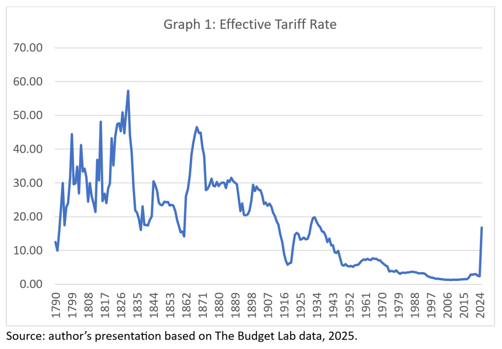 Looking at the broader picture, the Trump administration’s assault on the liberal international order in trade is hard to understate. Graph 1 displays historical data calculated by The Budget Lab (TBL) at Yale University (in early 2025) of the US’s “effective tariff rate”: i.e. the average import tariff weighted by the composition of imports. During the 19th century, the US industrialised behind trade barriers. By contrast, tariffs declined for most of the 20th century, especially after World War II. The impact of the Trump presidencies is thus striking: during Trump I, the effective tariff rate doubled from around 1.5% to nearly 3%. Yet this pales into insignificance with Trump II, when the average effective tariff rate rose from 2.4% at the start of 2025 to 16.8% at the end of November 2025: the OECD and others indicate 14% at year's end. It is truly in a new era.