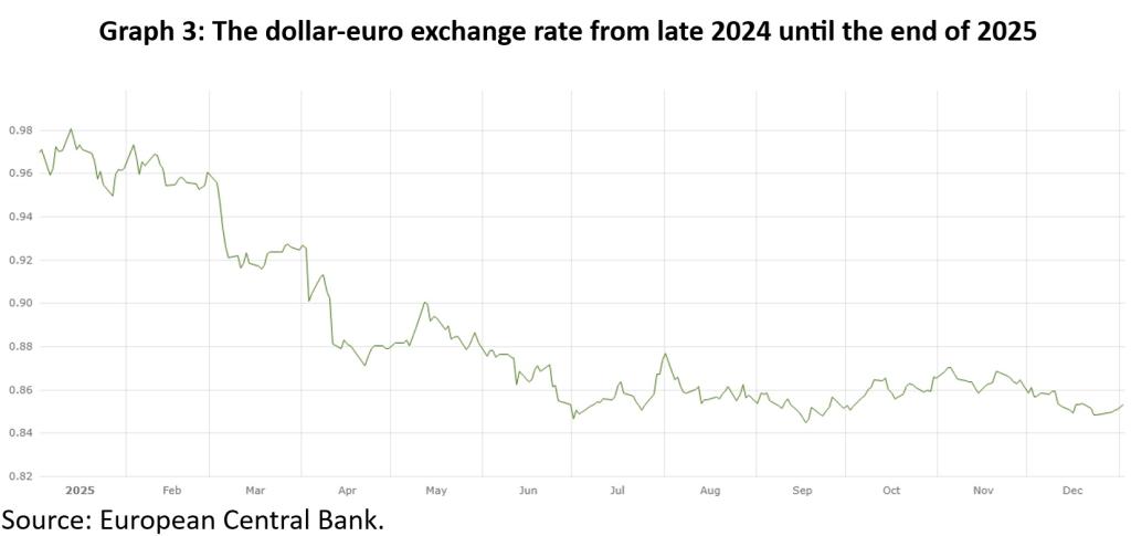In the immediate wake of Liberation Day, the dollar fell as US financial markets dropped rapidly. Graph 4 shows the fall of the dollar from about €0.96 to €0.86 in the first half of 2025 (i.e. around 10%), before stabilising. For European exporters, this makes trading with the US (and countries with dollar pegs) even more difficult.