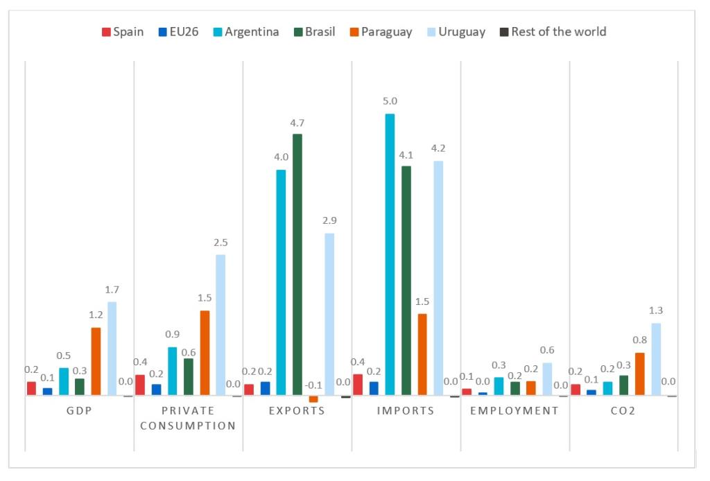 At the same time, the EU-Mercosur agreement has sparked debate about its potential environmental impact. However, in Mercosur, Spain and EU26, the treaty generates efficiency in terms of CO2 emissions. In other words, the economic growth driven by the agreement is less CO2-intensive than before the agreement.
